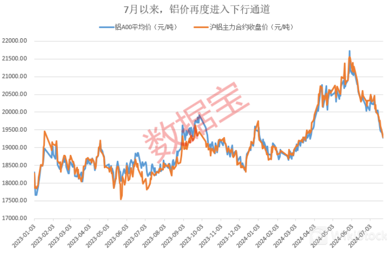 随后消息面转弱,叠加当前处于铝行业传统消费淡季,下游采购意愿较弱,铝锭库存增加,铝价从高位显著回落。7月中旬以来,铝价再度进入下行通道,沪铝主力跌至19500元/吨以下,现货铝(A00)平均价为19280元/吨,较上一交易日减少130元/吨。