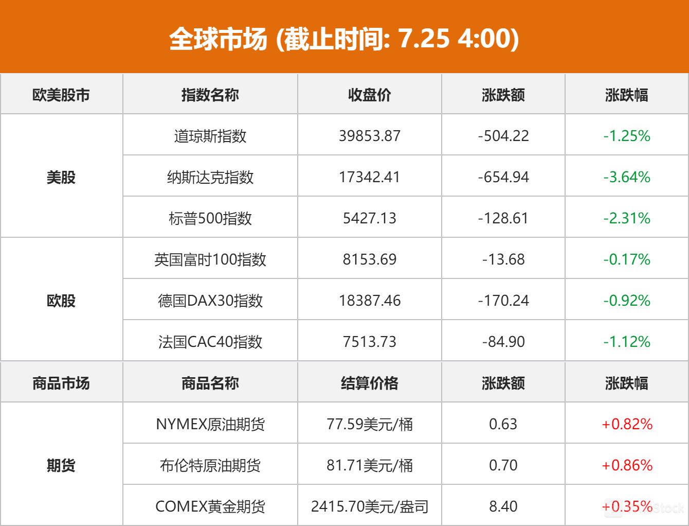 美股市场:美股三大指数集体收跌,纳指跌超3%,截至当天收盘,道琼斯工业平均指数比前一交易日下跌504.22点,收于39853.87点,跌幅为1.25%;标准普尔500种股票指数下跌128.61点,收于5427.13点,跌幅为2.31%;纳斯达克综合指数下跌654.94点,收于17342.41点,跌幅为3.64%。