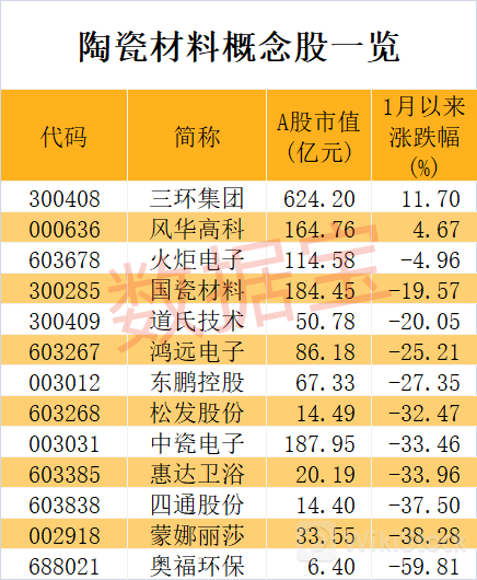 A股市场上,具备陶瓷材料相关业务的公司数量不多,仅13家。截至7月26日收盘,概念股合计A股市值1569亿元。今年以来,这些概念股平均下跌24.33%,三环集团(300408)、风华高科(000636)股价逆势上涨,累计涨幅分别为11.7%、4.67%。