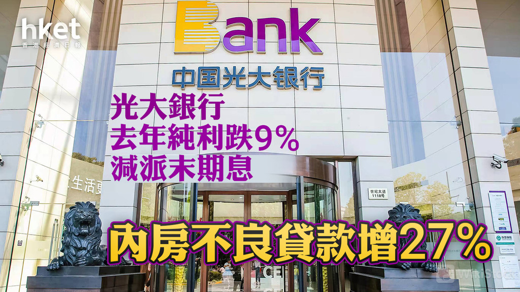 以行業劃分,光大銀行房地產業不良貸款餘額增27%至88億元,佔整體18.6%。另外,零售貸款不良貸款餘額增24%至206億元,都是年內升幅較明顯的類別。不過,製造業、批發及零售業企業情況轉好抵銷部分不利因素,光大銀行去年底不良貸款餘額整體增6%至475億元。