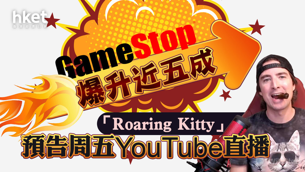 迷因股遊戲驛站GameStop(美︰GME)又爆升。被視為推動買入GME的領軍人物Keith Gill(網名「Roaring Kitty)預告將於YouTube進行直播。直播於紐約時間周五(7日)中午12點進行。但GME股價先行炒上,GME周四(6日)爆升47.5%,收報46.55美元,GME周五盤前曾升37.2%,高見63.87美元。